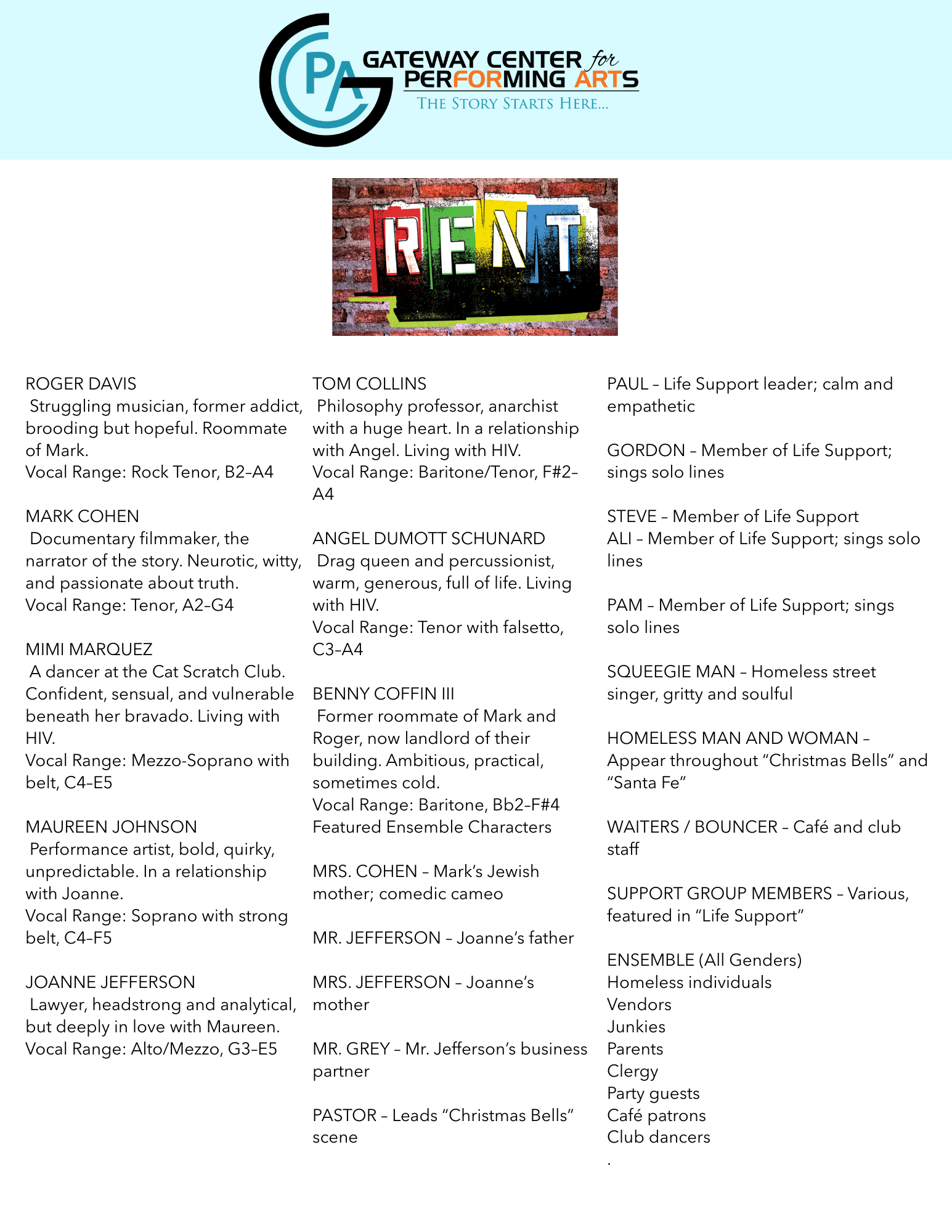 RENT is a contemporary rock musical with mature themes. Full details about content are in the audition form. Performers should carefully review the general and character-specific considerations below before auditioning.